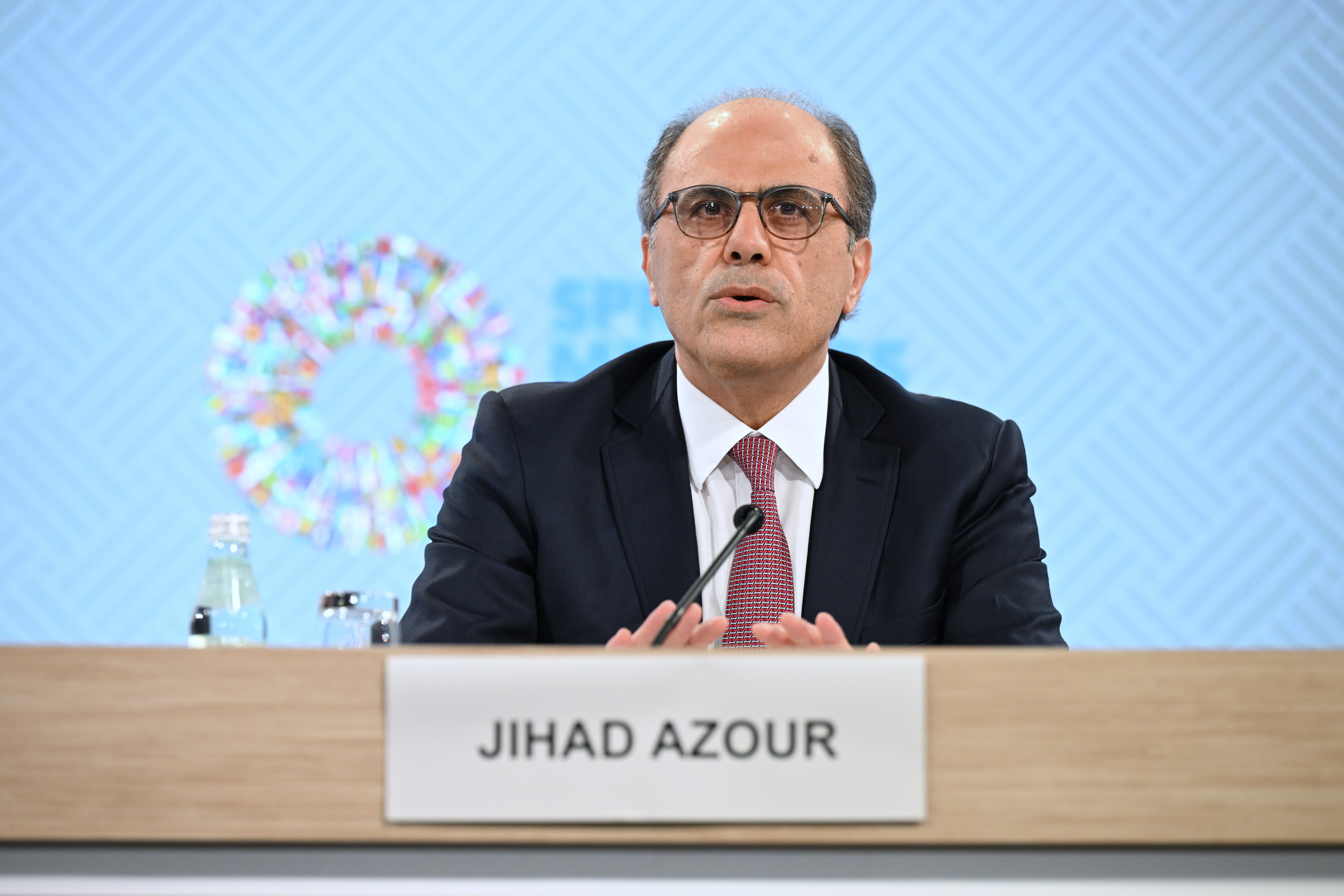 4月16日,在美国华盛顿,国际货币基金组织(IMF)中东和中亚部主任吉哈德·阿祖尔在新闻发布会上讲话。
